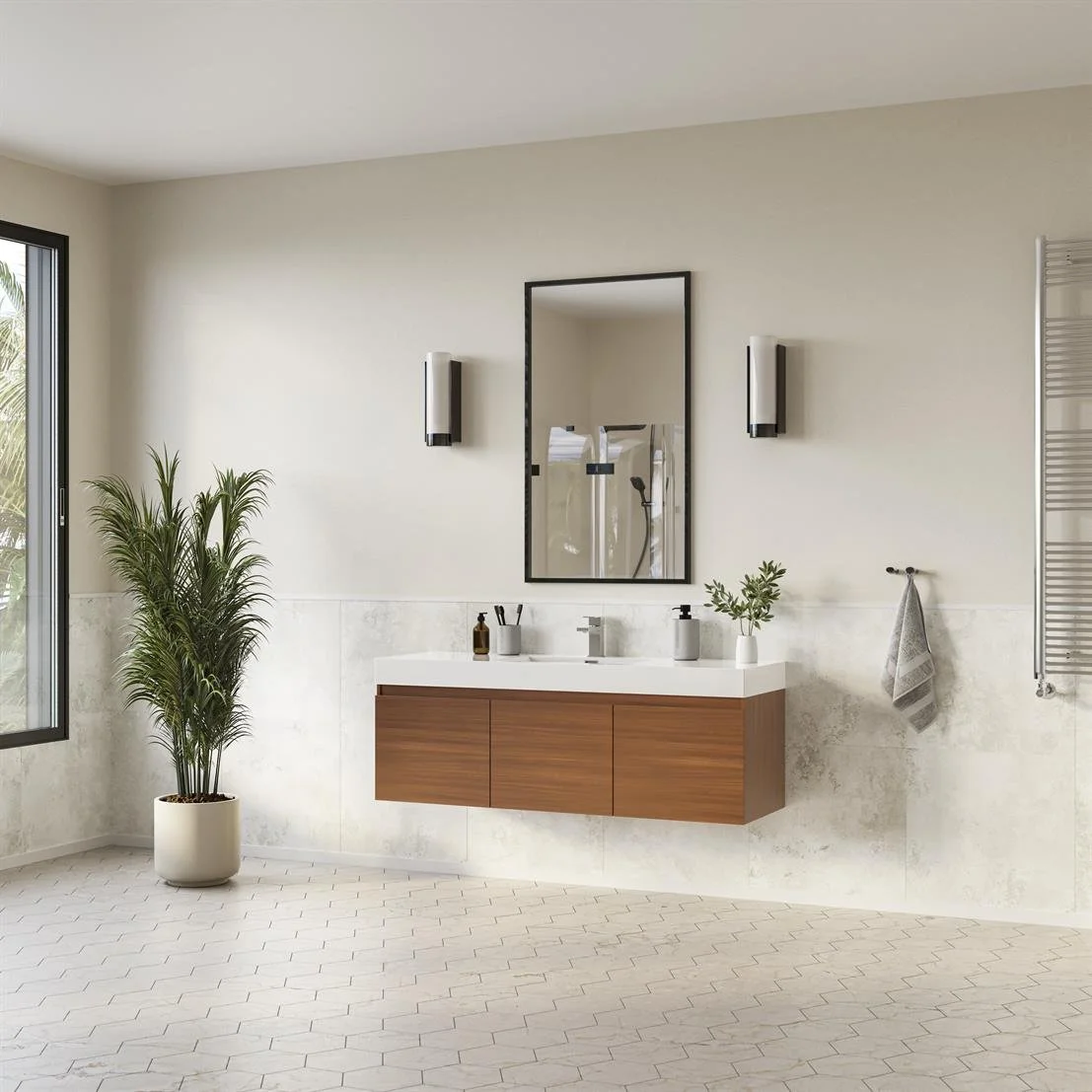 A wall-mounted vanity is secured directly to the wall, leaving the floor space beneath exposed. This design creates the illusion of a larger bathroom while contributing to a sleek, modern aesthetic.